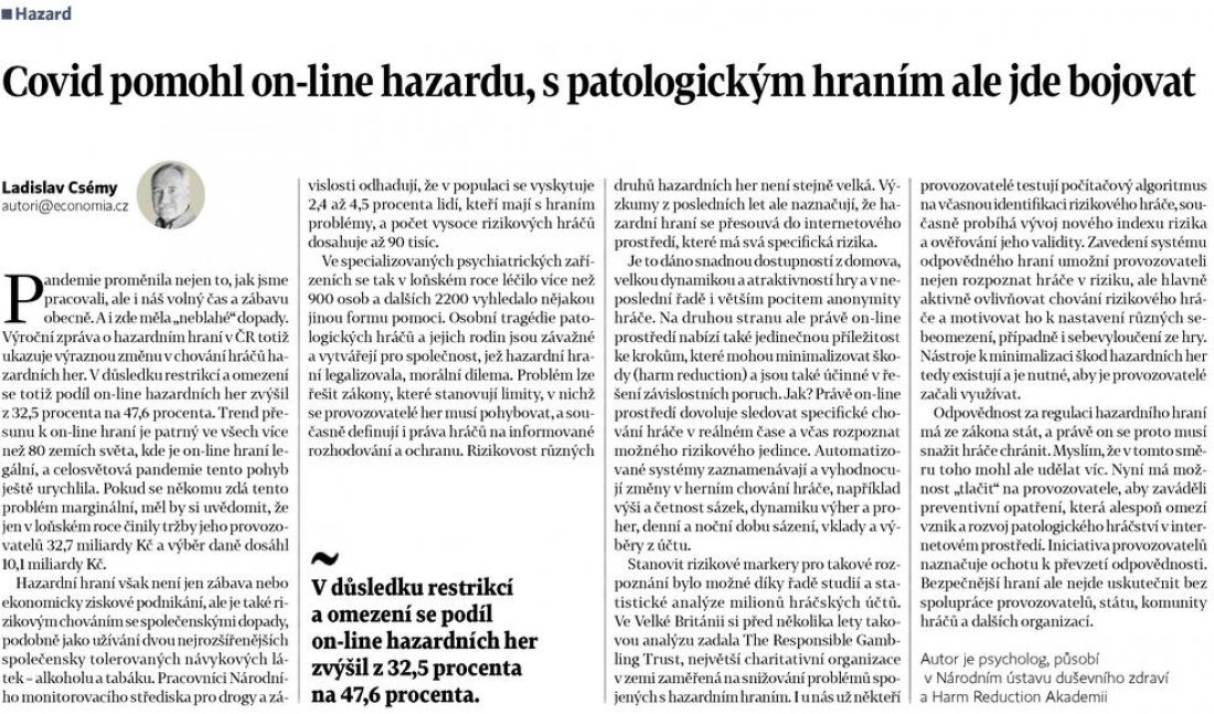 Phdr. Ladislav Csémy, psycholog, působící v Národním ústavu duševního zdraví a Harm Reduction Akademii, zhodnotil současný stav hraní hazardních her v České republice a nastínil současné a budoucí možnosti odhalování rizikového hraní u hráčů.